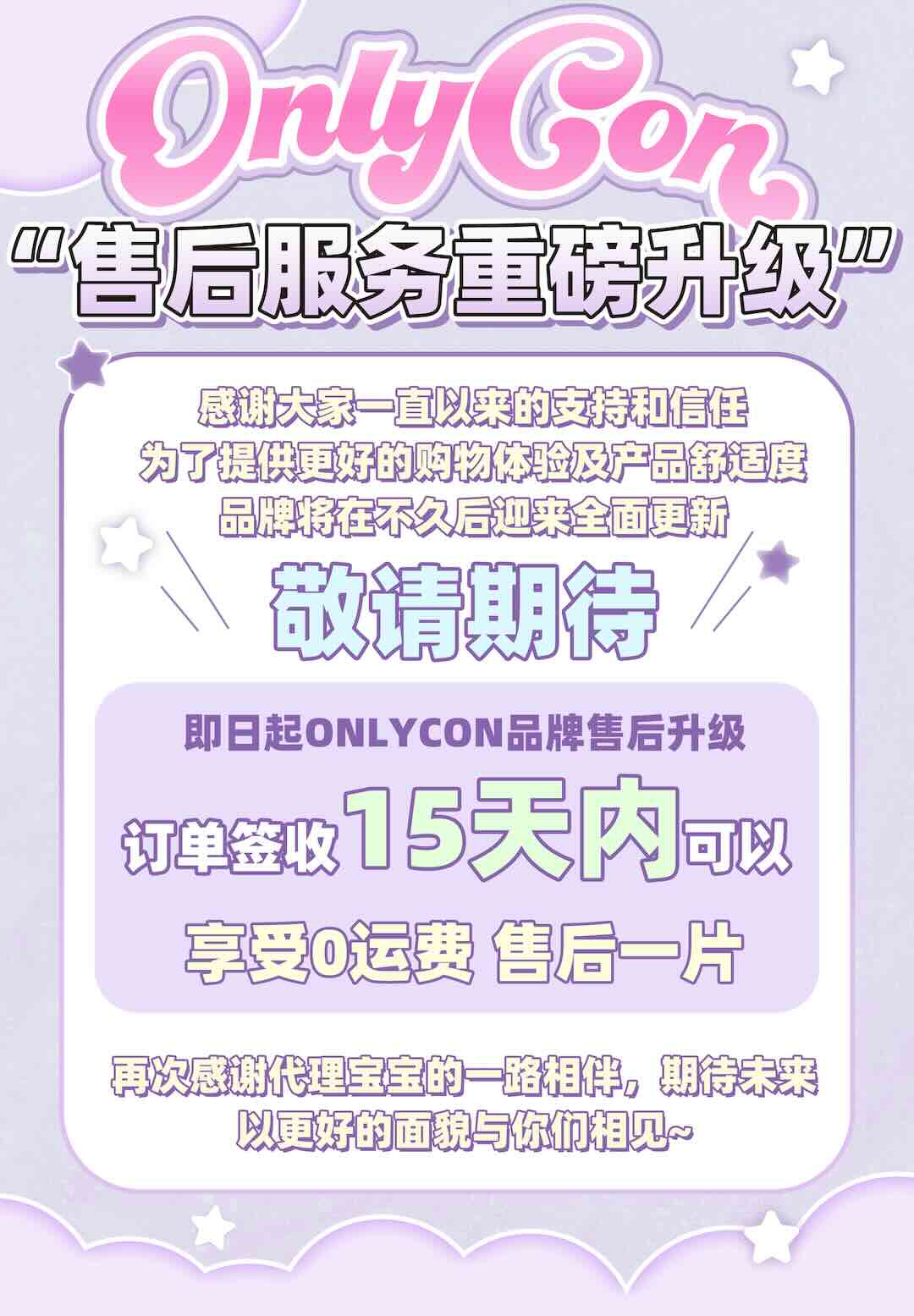 即日起ONLYCON品牌售后同步升级 订单签收起15天内可0运费售后一片